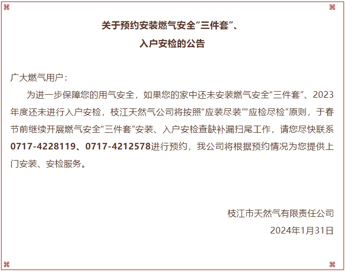 你家里燃气安全“三件套”装了没?户内安全检查了没?